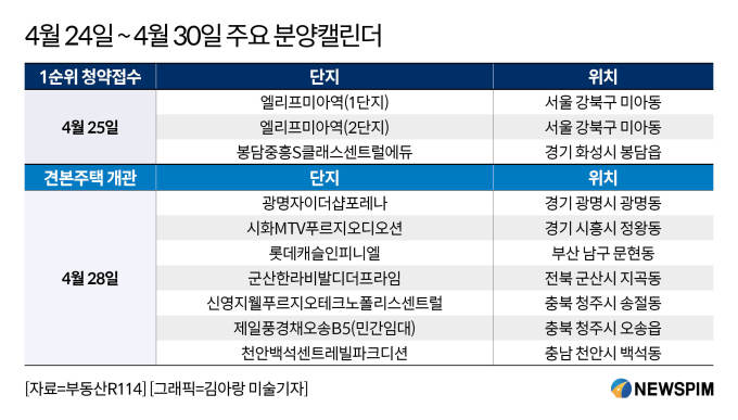 부동산R114에 따르면, 4월 넷째 주에는 전국에서 총 1,066가구(일반분양 1,032가구)가 분양을 시작하는 3개 단지가 있습니다. 서울 강북구 미아동 "엘리프미아역1·2단지", 경기 화성시 봉담읍 "봉담중흥S-클래스센트럴에듀" 등에서 청약을 받습니다. 모델하우스는 경기 광명시 광명1동 "광명자이더샵포레나", 경기 시흥시 정왕동 "시화MTV푸르지오디오션", 부산 남구 문현동 "롯데캐슬인피니엘" 등 7곳에서 오픈할 예정입니다.