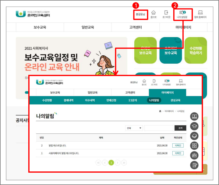 2. [나의알림함] 클릭 →마이페이지>나의알림 페이지로 이동하여 관리자가 보내준 알림 내용을 확인할 수 있습니다. 숫자 표시는 회원이 아직 읽지 않은 알림의 개수입니다.