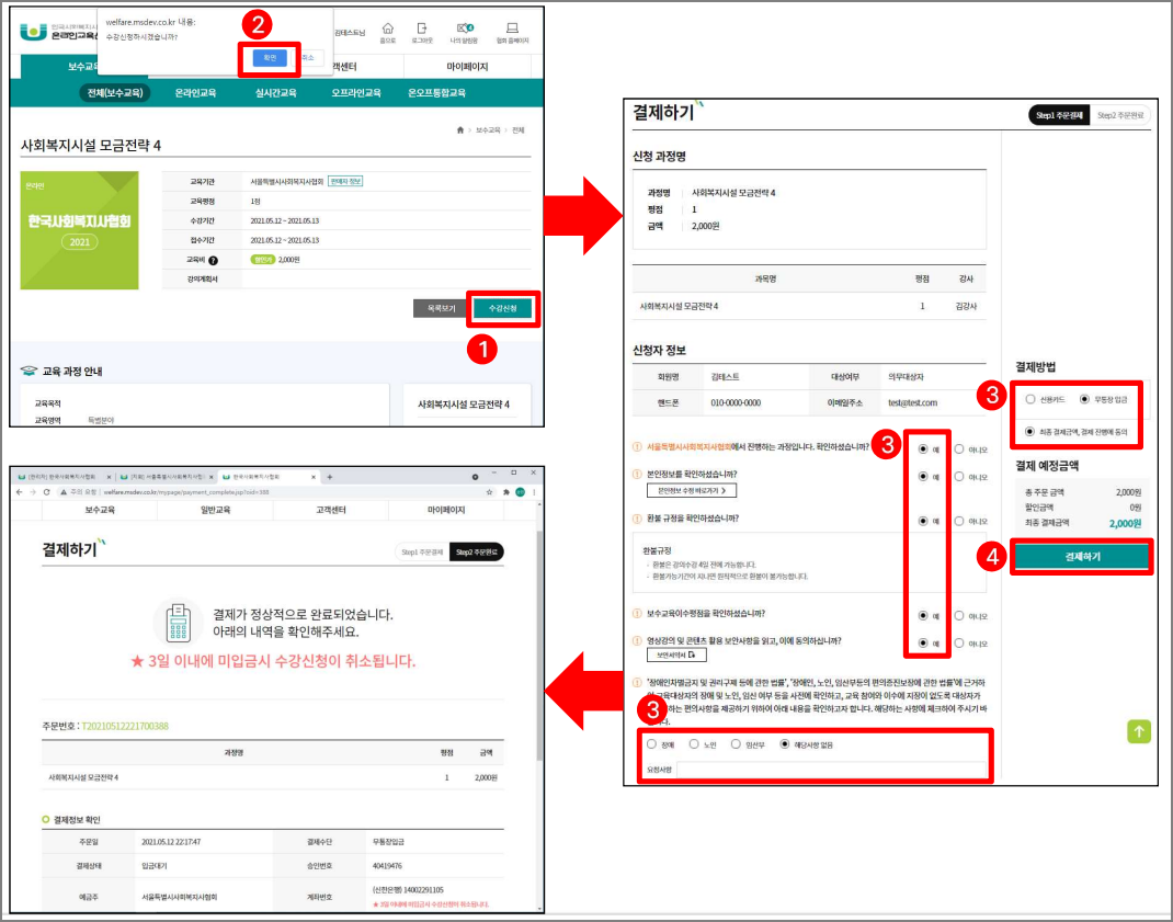4. [결제하기] 클릭→결제하기 버튼을 클릭하여 결제를완료합니다. 무통장 입금의 경우 3일 이내에 입금을 안 할 경우 수강이 자동 취소됩니다.