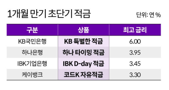 금융권에 따르면 하나은행은 이날 '하나 타이밍 적금'을 리뉴얼해 '1개월' 만기 상품을 선보인다. 1개월 만기는 연 3.95%다. KB국민은행은 오는 12일부터 1개월 만기 설정이 가능한 'KB 특별한 적금'을 출시합니다. 1개월 만기 최고 금리는 우대금리를 포함해 연 6%가 적용됩니다.